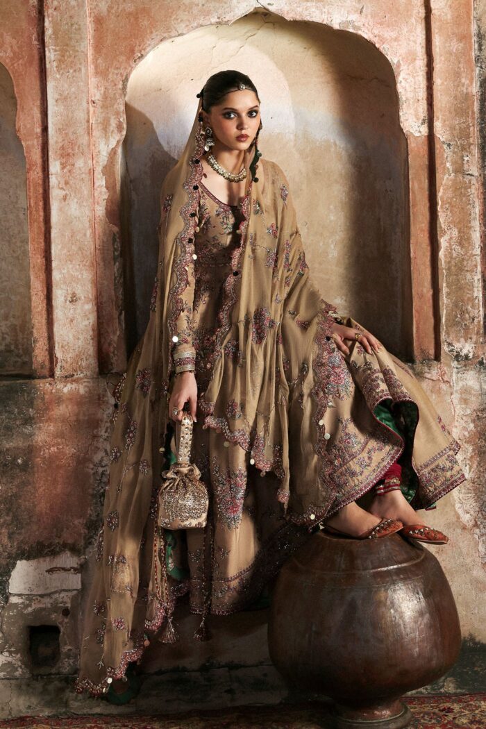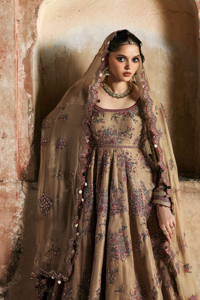 Beige pishwas is a regal creation, composed with Korean raw silk embroidered floral bunches with embroidered borders while the maroon pink Korean raw silk churidar balances the look with bold contrast. The chiffon dupatta with embroidered floral bunches adds richness. This attire blends elegance with grandeur, making it an ideal choice for weddings