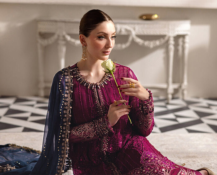 The back features printed fabric paired with an embroidered organza hem border, adding depth to the silhouette. The dupatta comes pre-embroidered on soft monar fabric with two detailed pallus crafted on organza, offering a statement finish. The solid dyed trouser is completed with a wide pre-embroidered border to add a graceful balance to the look.