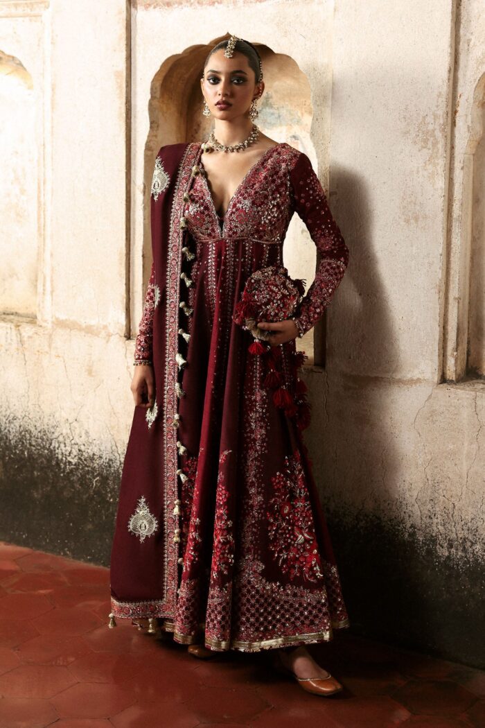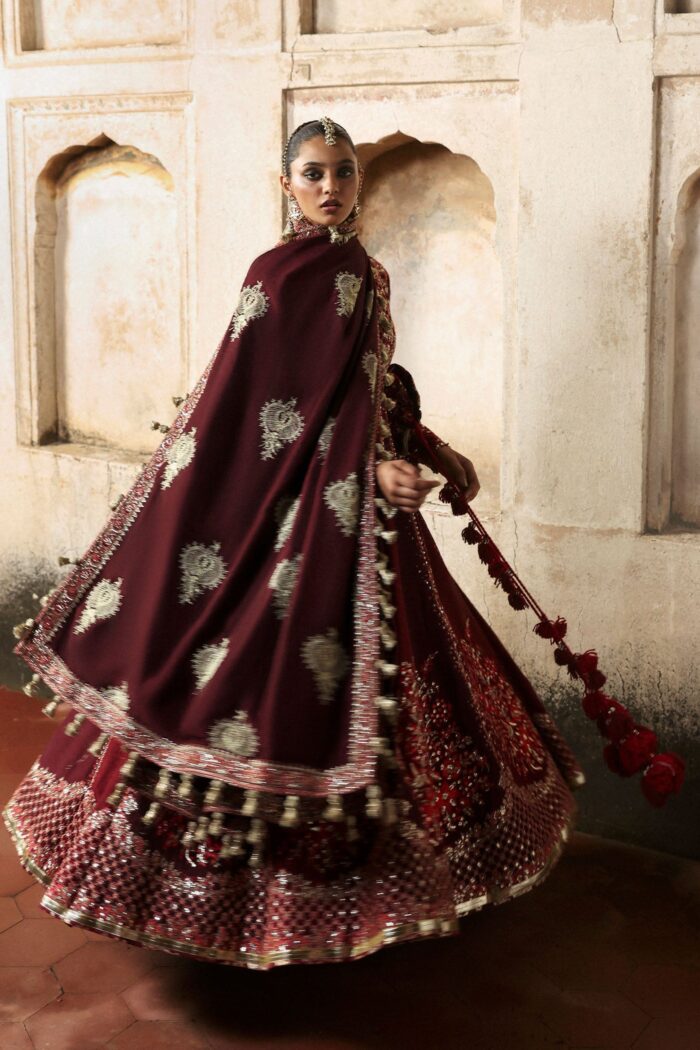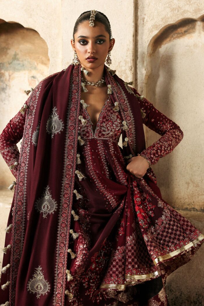 The embroidered burgundy and maroon Korean raw silk pishwas is beautifully crafted with intricate details on the front and back panels, adding richness to the overall look. It is paired with screen printed maroon Korean raw silk churidar that enhances the traditional appeal. The Korean raw silk shawl with tilla embroidered bunches and delicately embroidered borders on all four sides completes the outfit. Together, this ensemble radiates elegance and gives royalty