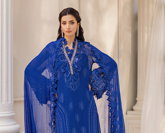 The back features printed fabric paired with an embroidered organza hem border, adding depth to the silhouette. The dupatta comes pre-embroidered on soft monar fabric with two detailed pallus crafted on organza, offering a statement finish. The solid dyed trouser is completed with a wide pre-embroidered border to add a graceful balance to the look.