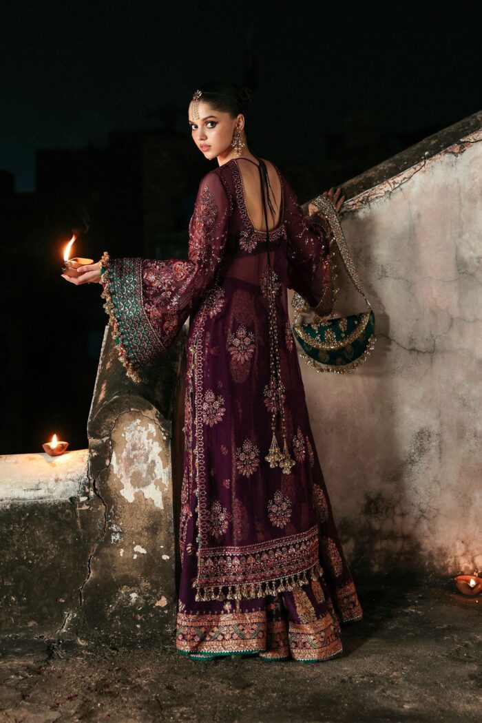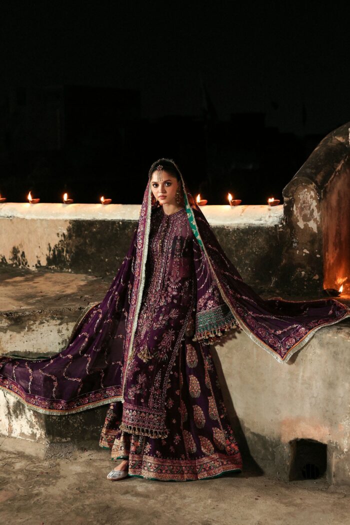 The formal embroidered chiffon shirt with embroidered borders, elaborate embroidery on front and back with intricate green sleeves border. The screen printed Korean raw silk lehenga complements the ensemble, giving it a traditional yet graceful finish. The chiffon embroidered dupatta with its vibrant colors and four-sided embroidered borders complete the look. This attire is perfect for festive gatherings